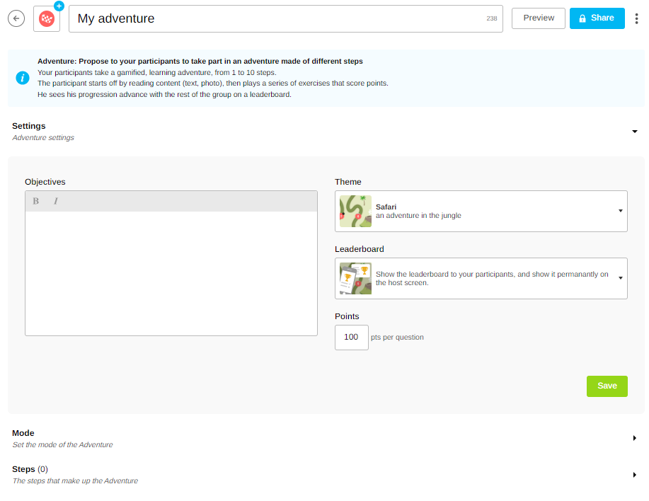 From your home page, click on ‘New’, then on ‘Adventure’.