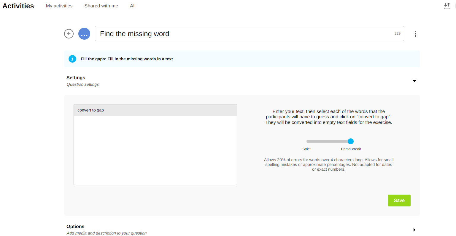 Choose "Strict" if you want points to be awarded only if the word is spelled exactly the same as the one you hid, or choose "Partial Credit" if you want to allow a small difference to be tolerated
