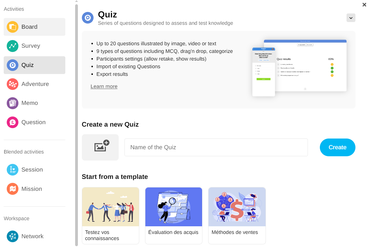 In Klaxoon Home, click on NEW and then on QUIZ.