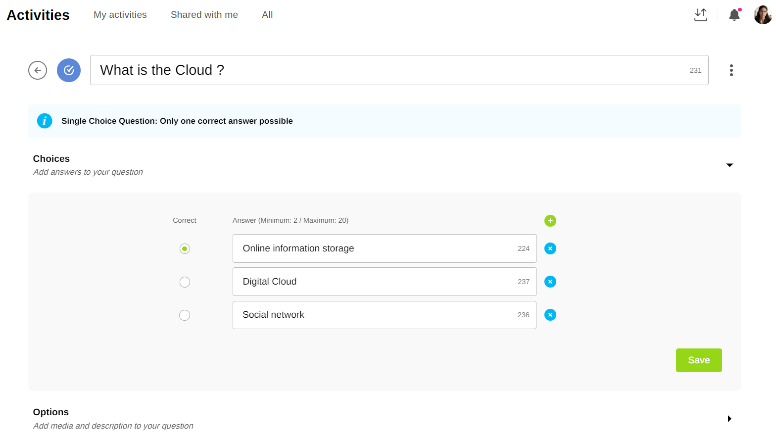 (Optional) In the Options box, add a media file and/or a description (additional instructions), then click on save.