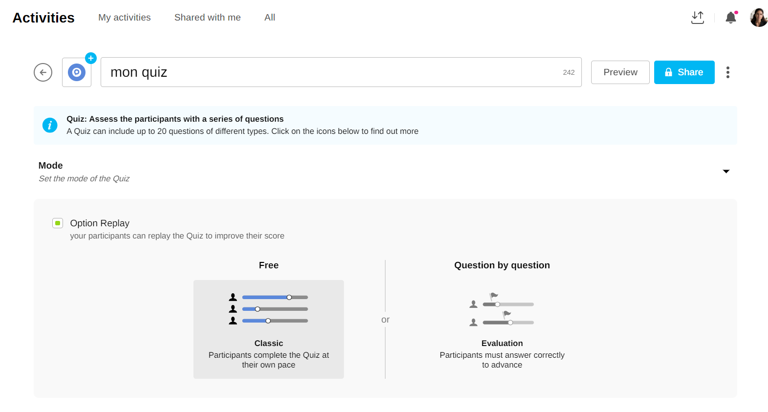 Free – Classic: After answering a question, participants move on to the next one, even if they have answered incorrectly. They can display corrections.