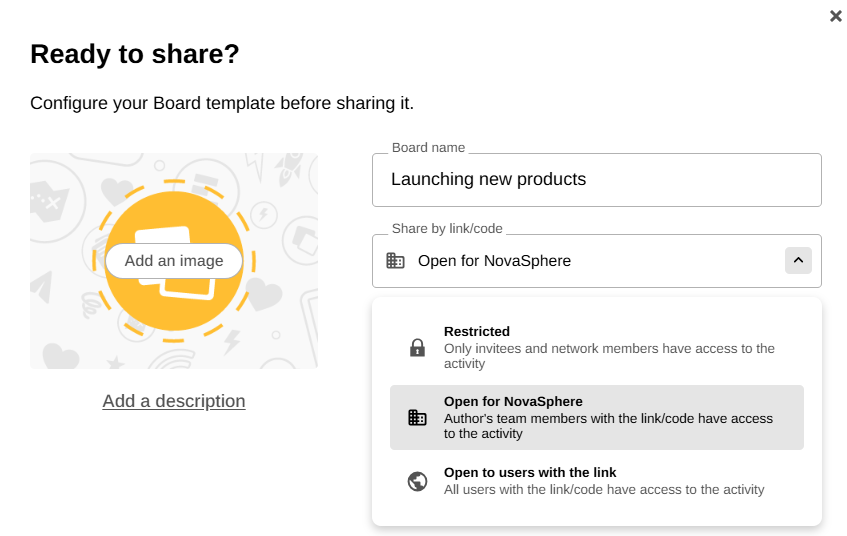Other options are available. You can limit sharing (only guests and network members have access to the activity) or allow all users with the link/code to access it.