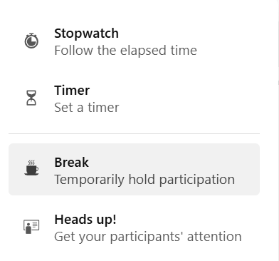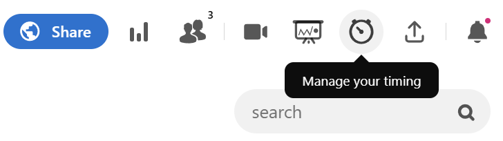 To start your event and allow participants to join the activity, simply click on the "Manage your time" icon again and then on the "Resume" option (the "Pause" option will have been replaced by "Resume"). The Session will open immediately for everyone.