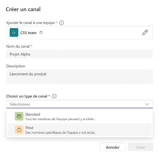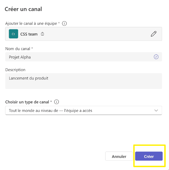 Une fois le canal crée, il s'ajoute à l'équipe souhaitée.