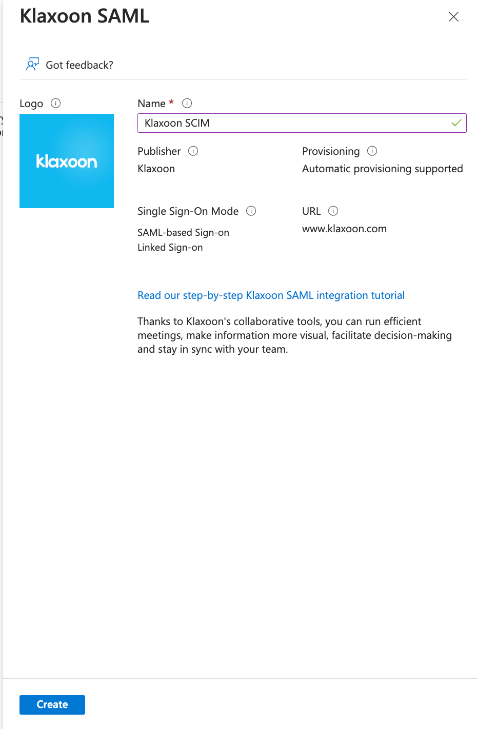 Renommez l'application en Klaxoon SCIM (ou tout autre nom de votre choix), puis cliquez sur Create (Créer) pour créer l'application