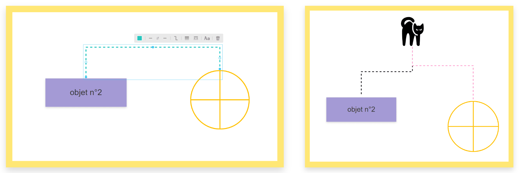 Des poignées apparaissent sur les objets quand vous cliquez dessus. Vous pouvez donc facilement les connecter entre eux sans avoir à passer par la barre d'outils.