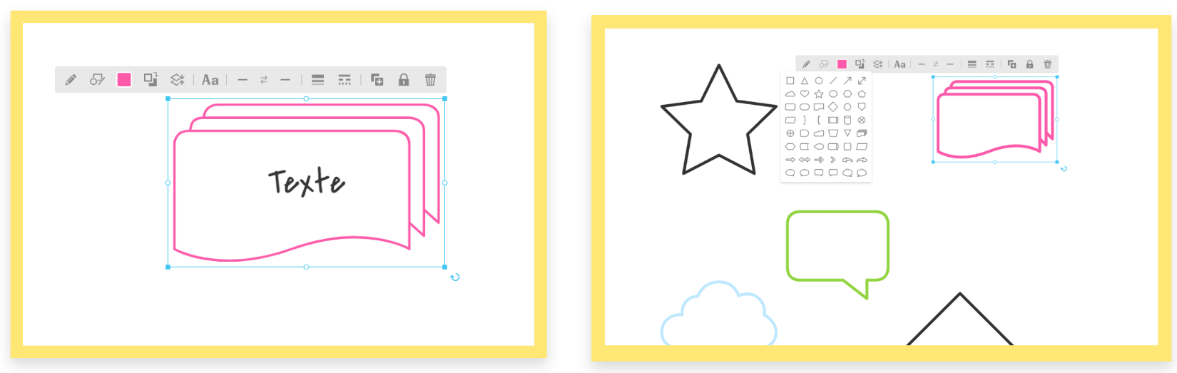 Il est possible d'écrire directement dans la forme en cliquant sur "Aa", et de personnaliser le texte selon ses envies. Ces nouvelles formes sont aussi modifiables avec l'outil Plume. Vous pouvez également changer de forme à tout moment, en cliquant dessus puis sur "changer de forme". Les paramètres associés (couleur, type et taille de trait, texte de la forme, etc) sont conservés.