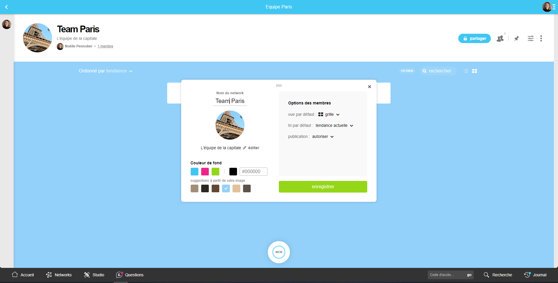 Une modale de paramètres nouvellement disponible pour le créateur et les co-admins du Network permet désormais aussi d'éditer le Network. Celle-ci s'ouvre automatiquement à la création du Network, sinon elle est accessible depuis le menu en haut à droite via l'option 'Paramètres'.