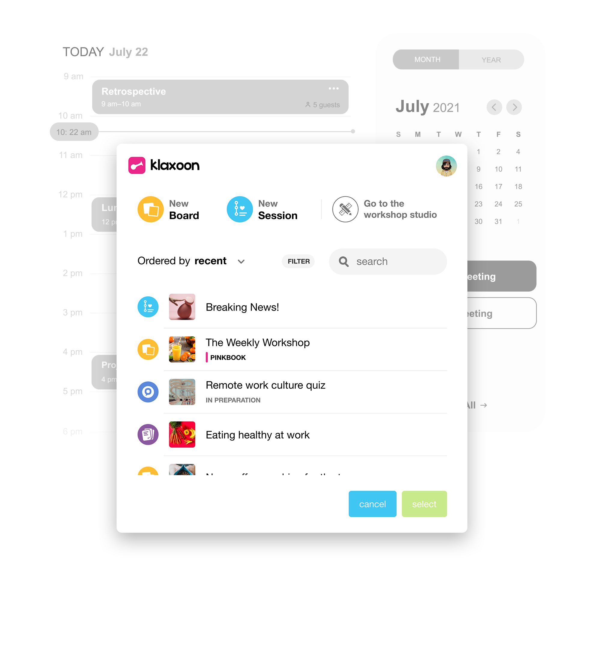 L'Activity Picker est un widget que vous pouvez lancer depuis vos applications. Une fenêtre s'ouvre dans votre solution et permet à vos utilisateurs de se connecter à Klaxoon, de choisir une Activité existante ou d'en créer une nouvelle. Les utilisateurs retrouvent la sensation familière de l'utilisation de Klaxoon, sans avoir à quitter votre application.
