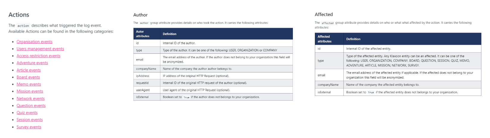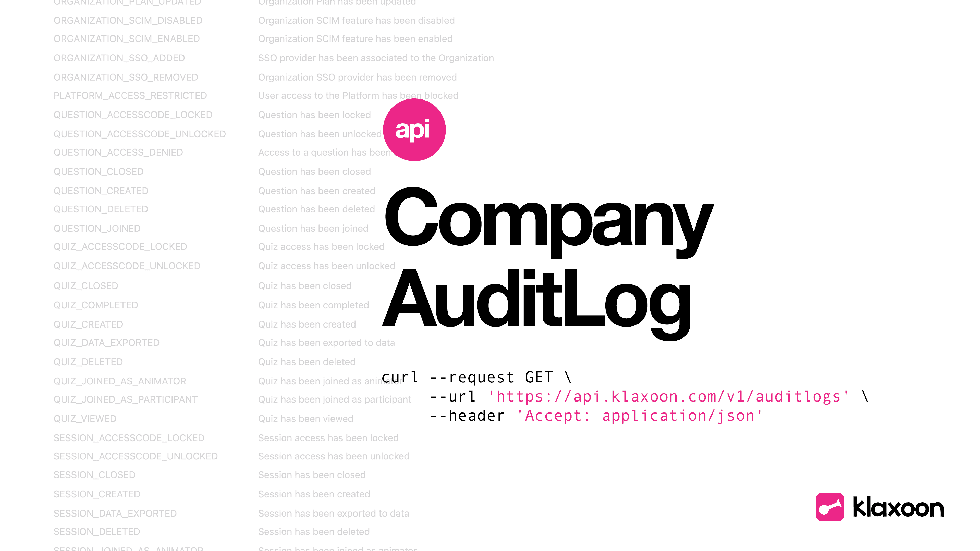 En tant qu'administrateur, vous pouvez aussi accéder à l'API AuditLog. La mise en place de cette API vous permet de collecter les journaux d'événements Klaxoon de votre organisation de façon programmatique. Cela garantit la traçabilité et la sécurité des actions réalisées par vos utilisateurs au sein de Klaxoon.