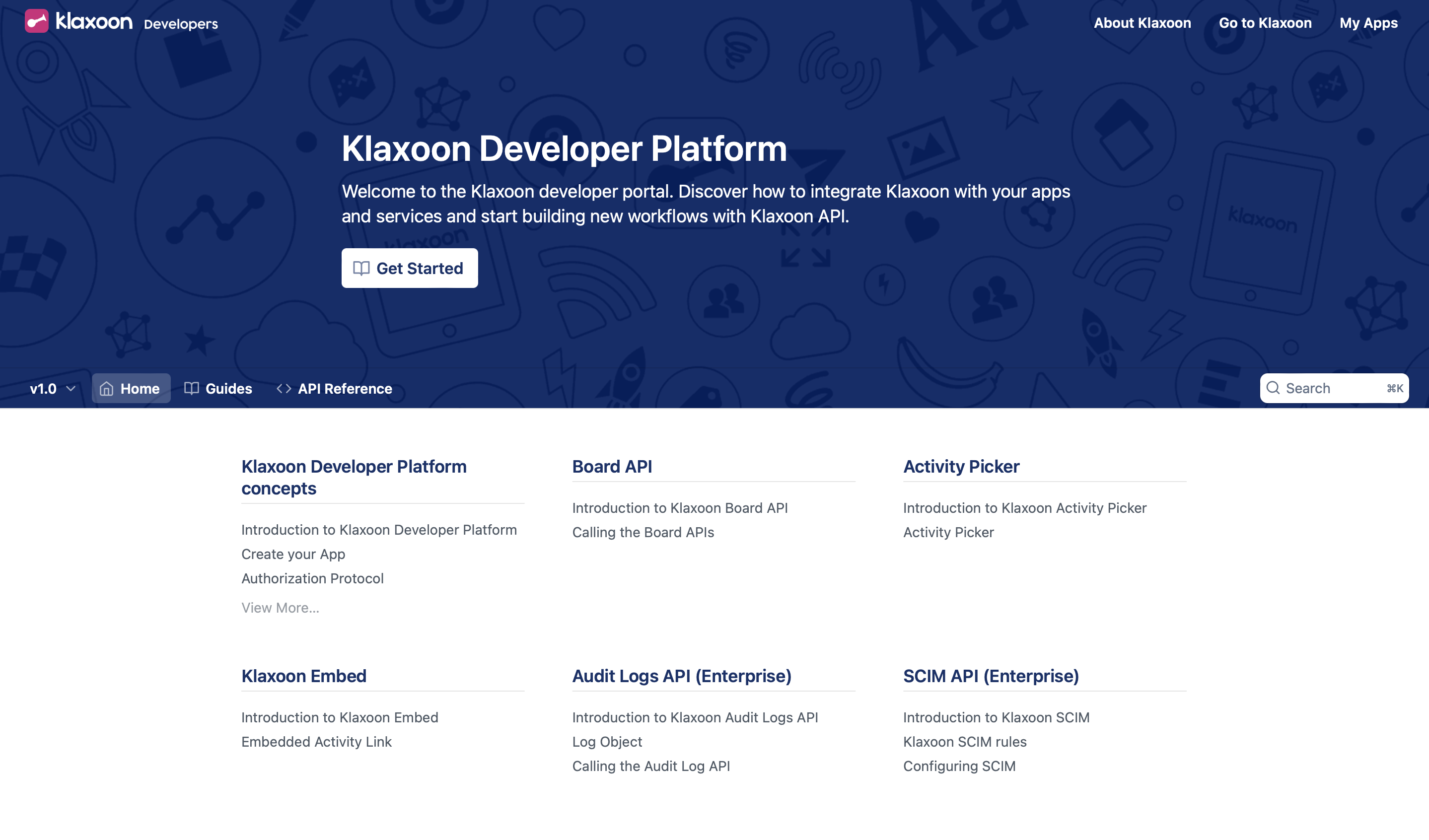 Vos applications et services peuvent désormais communiquer avec Klaxoon ! Retrouvez dans la Klaxoon Developer Platform toutes les informations nécessaires pour enregistrer vos applications et utiliser les APIs Klaxoon. Les possibilités sont infinies : collecter les journaux d'événements de votre organisation, lancer des activités Klaxoon directement depuis vos applications, gérer vos utilisateurs, connecter vos applications à Board...