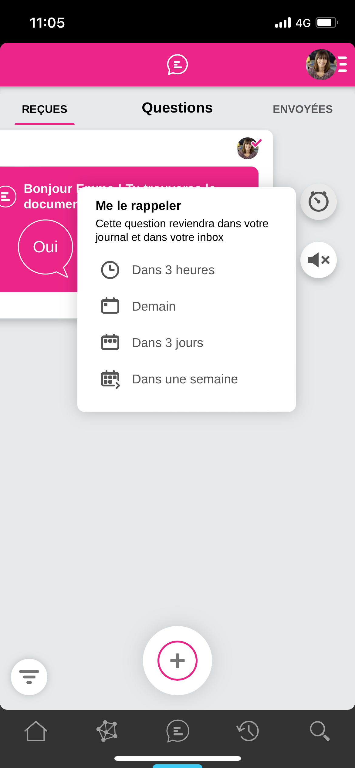 Il est maintenant plus simple d'utiliser Questions ! Lorsque vous recevez une Question, vous pouvez planifier un rappel pour y répondre plus tard.