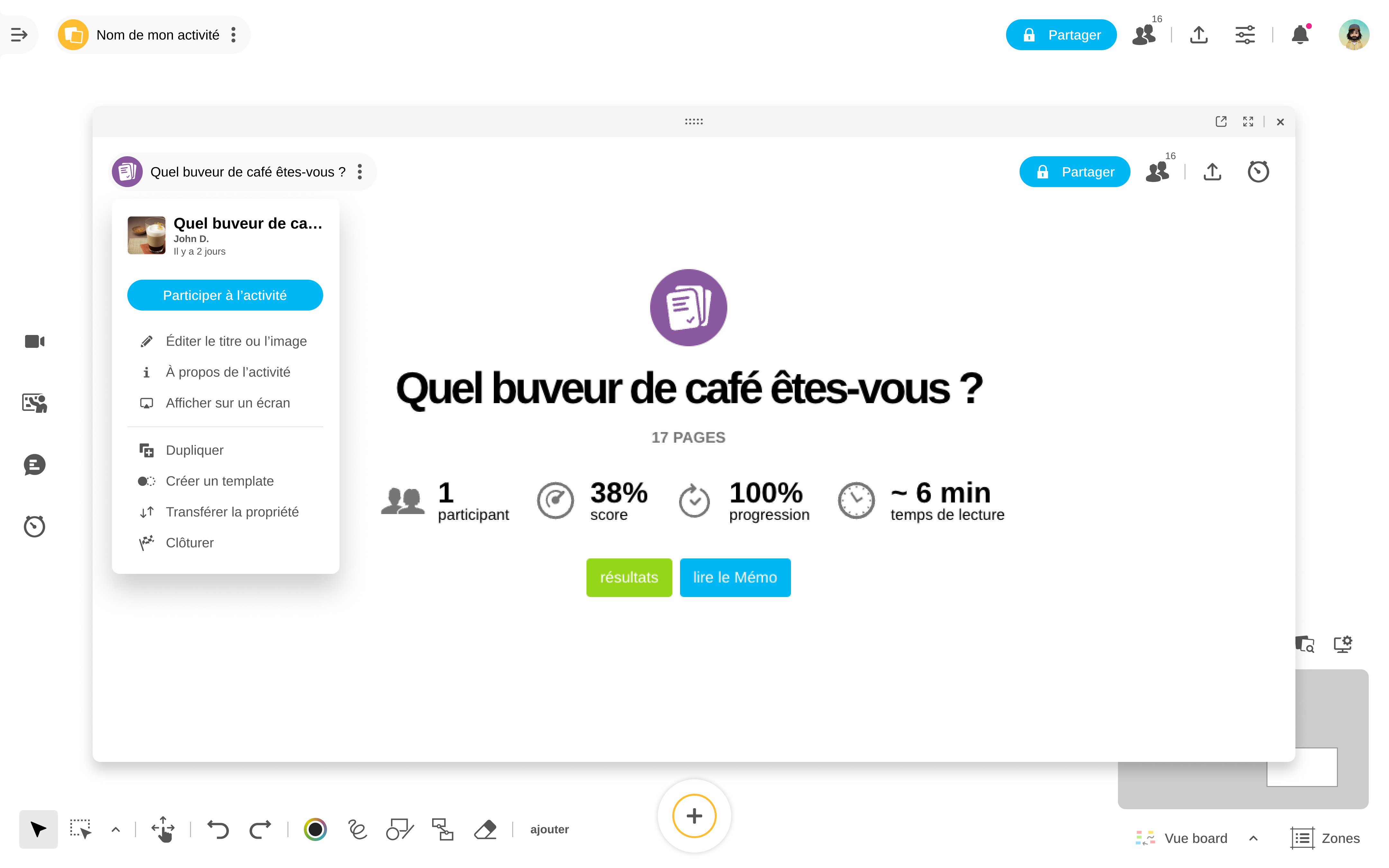 En tant qu'animateur, vous aurez la possibilité de basculer entre la vue animateur et la vue participant sur votre Activité. Cela signifie que vous pourrez choisir de participer à votre Activité en tant qu'animateur ou en tant que participant. Pour changer de mode, il vous suffit de cliquer sur les trois petits points à côté du nom du Board, puis de sélectionner "Participer à l'activité". Pour revenir en mode animateur, vous devrez répéter les mêmes étapes et cliquer sur "Animer l'activité".