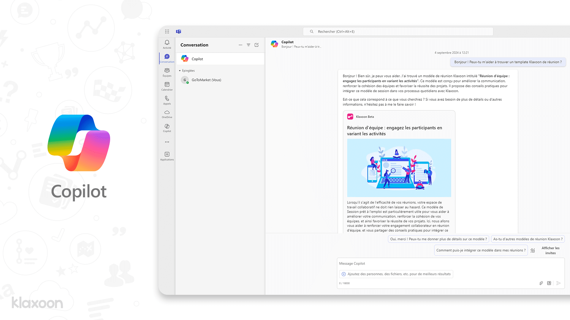 Après l'intégration complète de Klaxoon dans Microsoft 365, que ce soit via l'application personnelle ou en ajoutant vos activités dans un chat ou un email, une nouvelle étape est franchie : Klaxoon est maintenant intégré à l'IA Copilot !