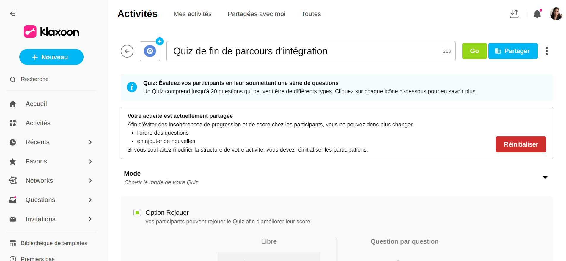 Il vous arrive de créer des activités, les partager pour les tester, puis de réaliser qu'il n'est plus possible d'y apporter des modifications ? Il est désormais possible de réaliser des changements à tout moment, grâce au bouton "Réinitialiser" !