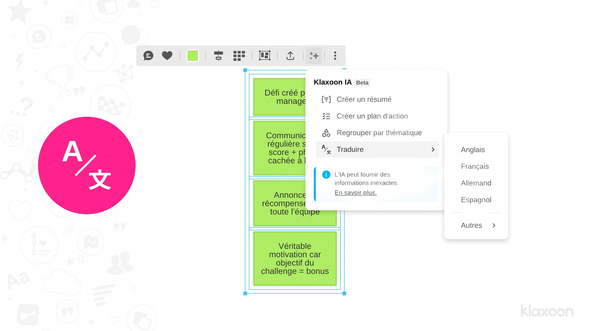 Vous est-il déjà arrivé de devoir traduire un Board, élément par élément, et de devoir basculer sur un outil de traduction et effectuer de nombreux copier/coller ? Avec la nouvelle fonctionnalité d'IA dans Board, simplifiez-vous la vie en traduisant vos textes directement dans votre tableau blanc.