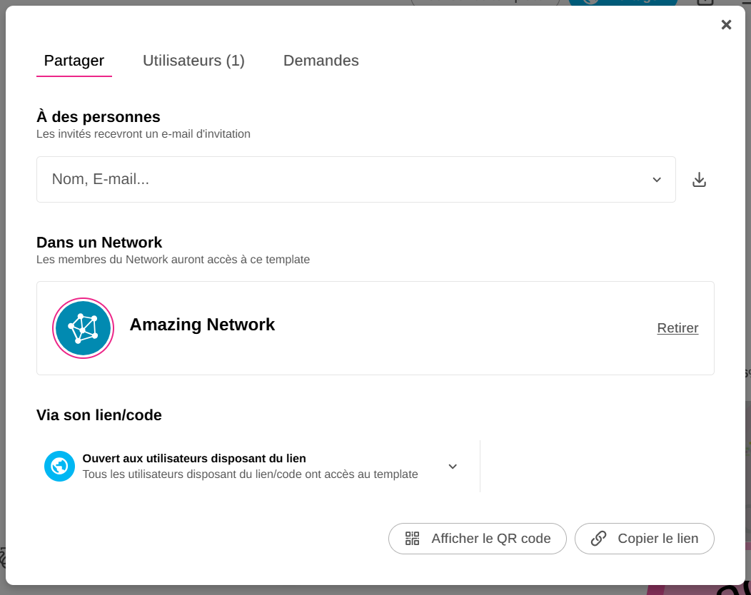 Le bouton “Publier” évolue pour devenir “Partager”, et s'aligner sur le mode de diffusion général des activités Klaxoon. Désormais, la publication dans un Network n'est plus l'unique moyen de partage de templates. Partagez vos Templates comme n’importe quelle autre activité Klaxoon, que ce soit via un Network, un code/lien ou une invitation directe.