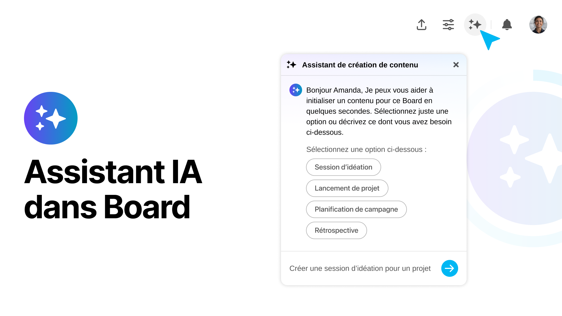 Depuis votre Board, cliquez sur l’icône IA, située en haut à droite, puis sélectionnez « Assistant de création de contenu ».