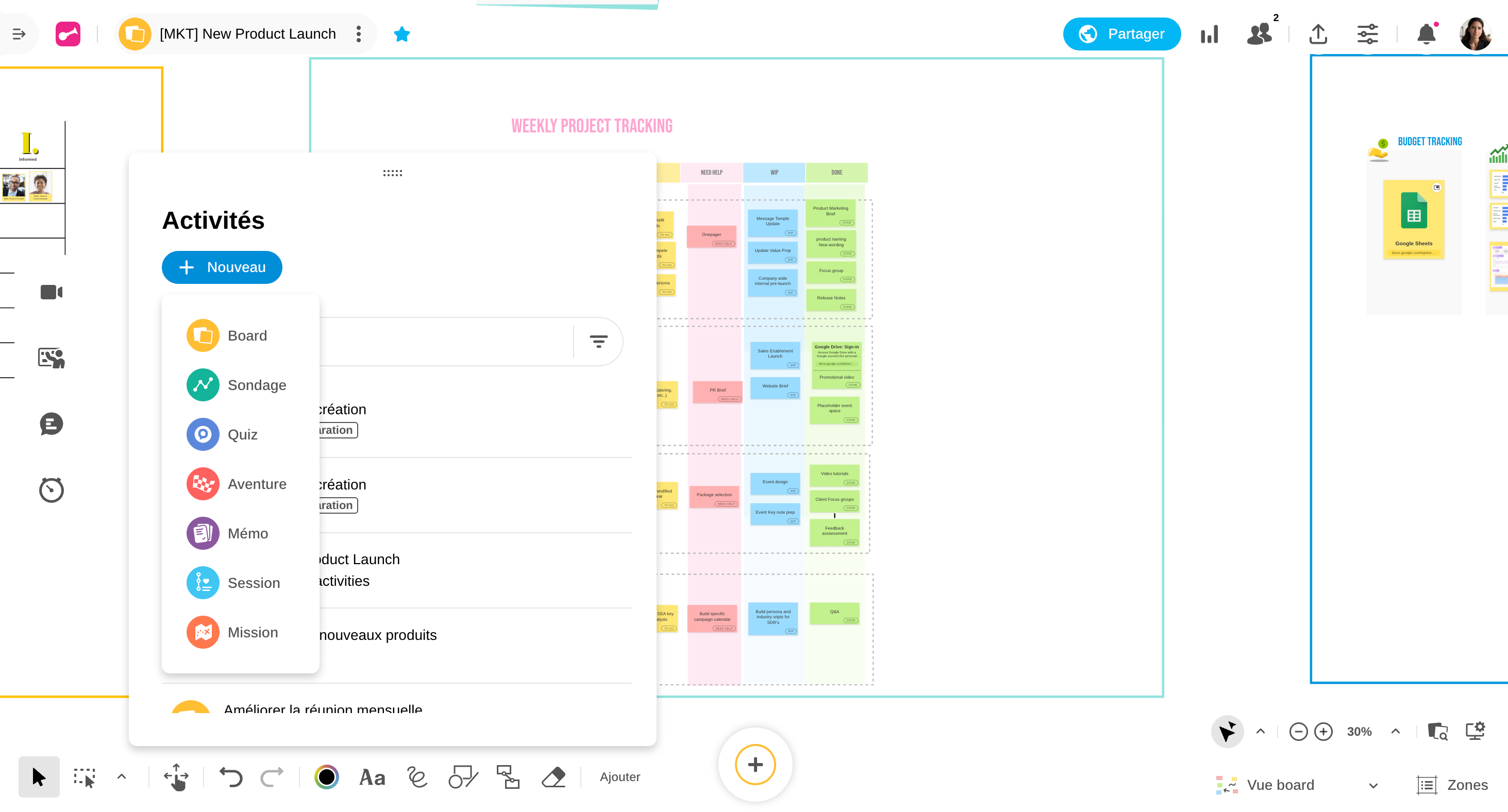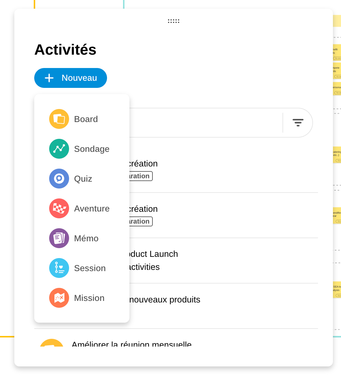 Dès que vous lancez la création d’une nouvelle activité depuis le menu 3pp en bas à gauche de votre Board, celle-ci s’ouvre désormais directement dans le Board. Cette évolution vous permet de rester dans votre espace de travail principal, sans interruption ni changement de contexte. Cela renforce la cohérence de l’expérience utilisateur, vous permettant de centraliser la conception, le lancement et l’animation des activités sur un seul écran.