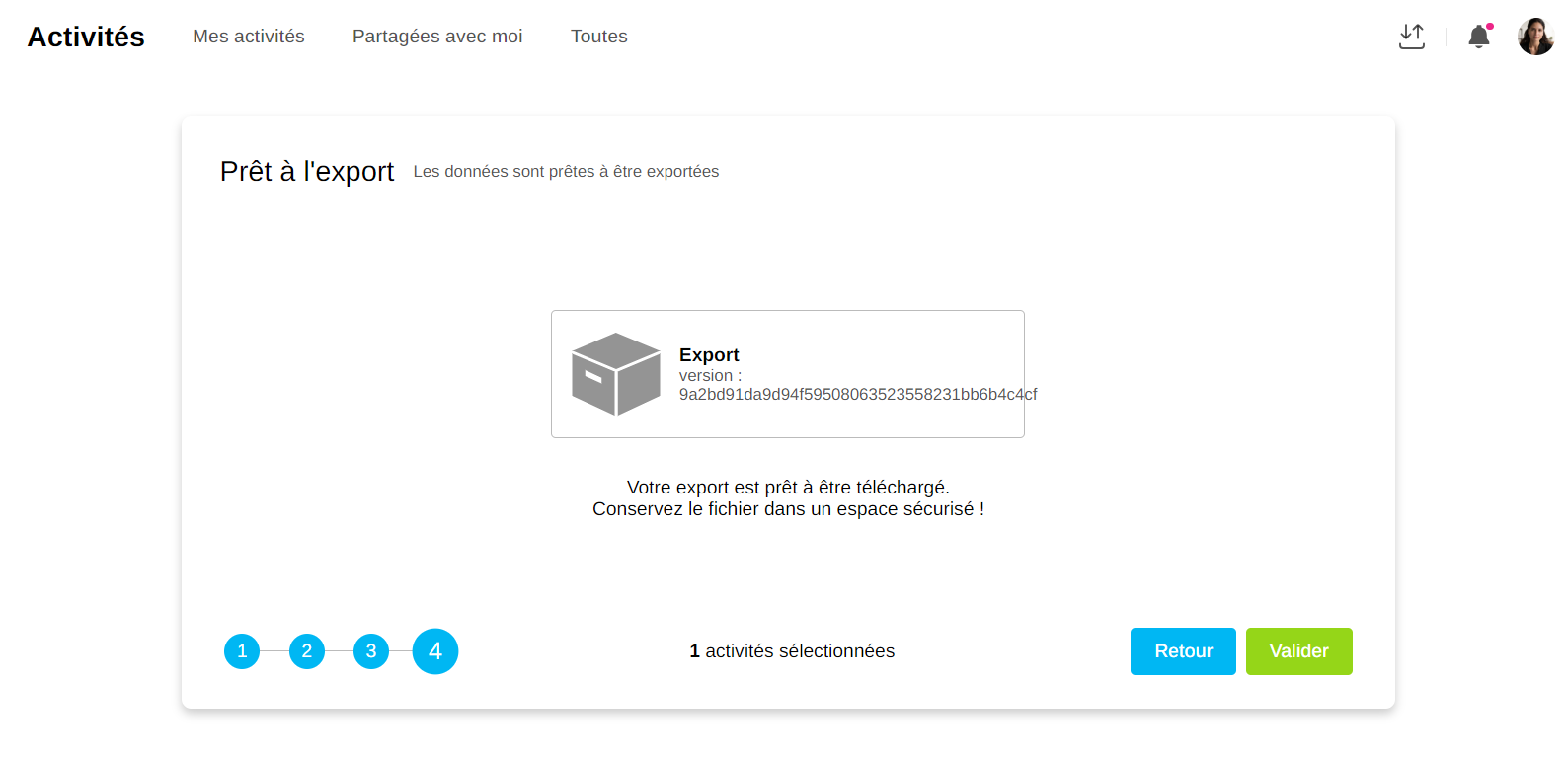 Dans l'onglet "Activités", vous pouvez exporter vos activités sous forme de fichiers KLX qui peuvent ensuite être réimportés dans un autre compte Klaxoon.