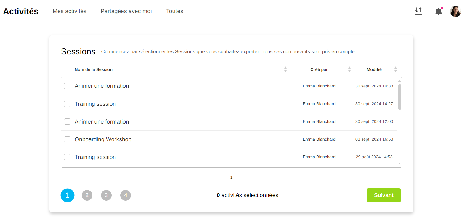 Cochez les cases des Sessions que vous souhaitez exporter puis cliquez sur SUIVANT