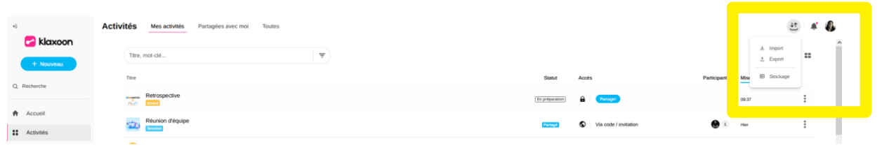 Depuis l'onglet "Activités", vous pouvez importer des activités sous la forme d'un fichier KLX exporté depuis un autre compte Klaxoon.