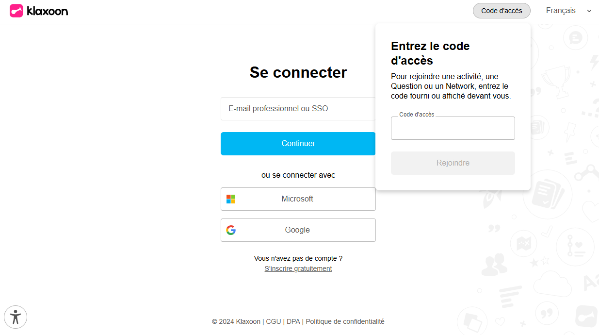 Le code d'accès peut également être renseigné depuis le site Klaxoon depuis le bouton "Connexion" situé en haut à droite