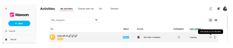 Une fois dans la vue "Activités", cliquez sur l'icône "étoile", à droite du titre de l'activité que vous souhaitez ajouter en Favoris
