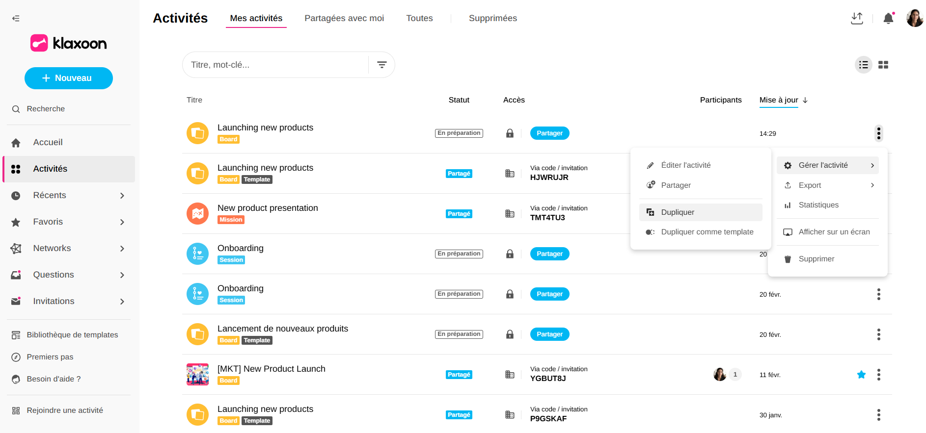 Depuis la page de vos activités, cliquez sur le menu "3 petits points" en bout de ligne de l'activité que vous souhaitez dupliquer. Puis glisser le curseur de votre souris sur "Gérer l'activité" et cliquez sur "Dupliquer".