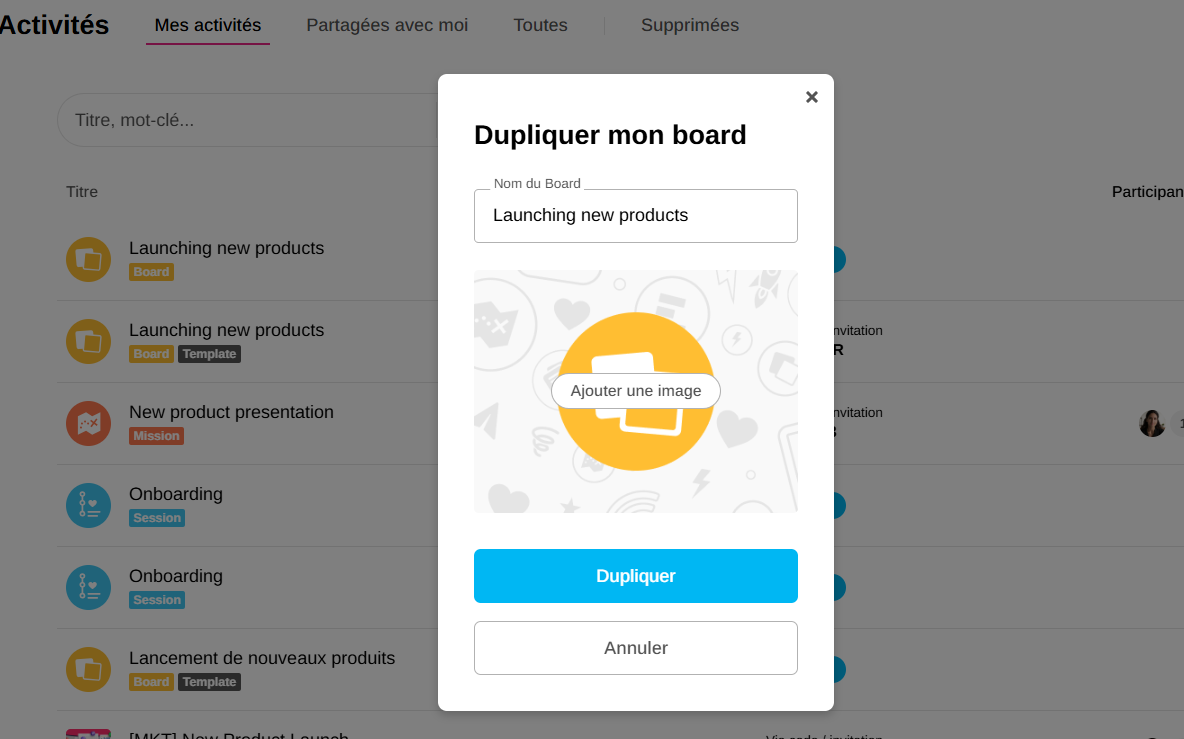 Une nouvelle fenêtre s'ouvre vous invitant à nommer l'activité puis valider la sélection en cliquant sur "Dupliquer".