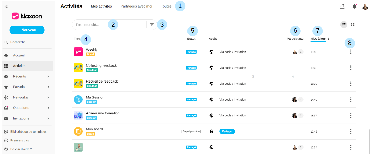 Sélectionnez un type d’activité ou un statut pour filtrer la liste.