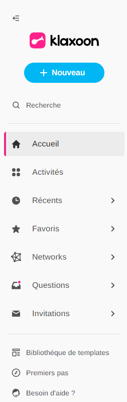 Ce bouton vous amène à la page d’accueil de Klaxoon, qui constitue un point de départ central pour l’exploration. Pour plus d’informations, consultez la page d’accueil.