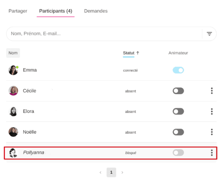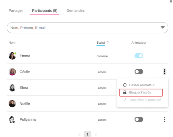 Cliquez sur les « 3 points » à la fin de la ligne du participant, puis sélectionnez « Bloquer l’accès ».