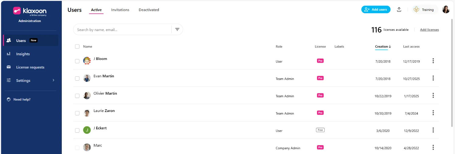 Connectez-vous à votre compte Klaxoon, puis cliquez sur votre photo de profil en haut à droite de l'écran. Dans le menu déroulant, sélectionnez "Administration" pour accéder à l'interface d'administration.
