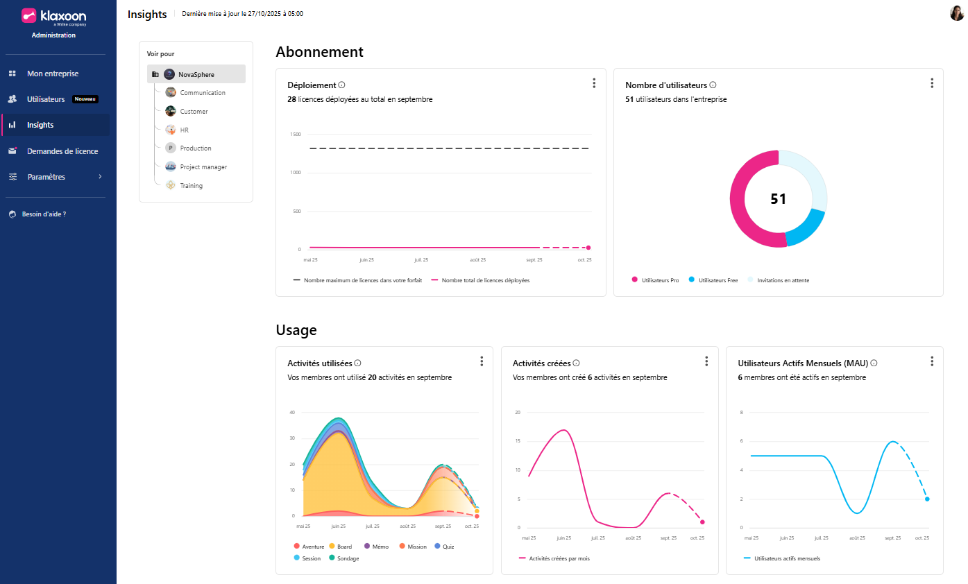 Pour y accéder, rendez-vous dans le menu situé sous votre photo de profil Klaxoon, et cliquez sur « Administration ».