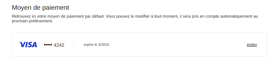 Pour modifier la carte de crédit associée à votre abonnement, cliquez sur Editer au bout de la ligne (paiement exclusivement par carte bancaire).