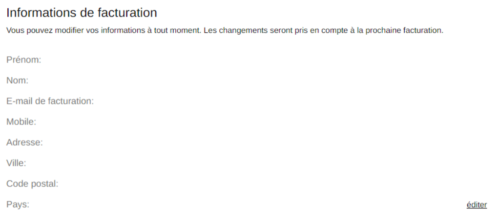 Pour modifier vos informations de facturation, cliquez sur "Editer".