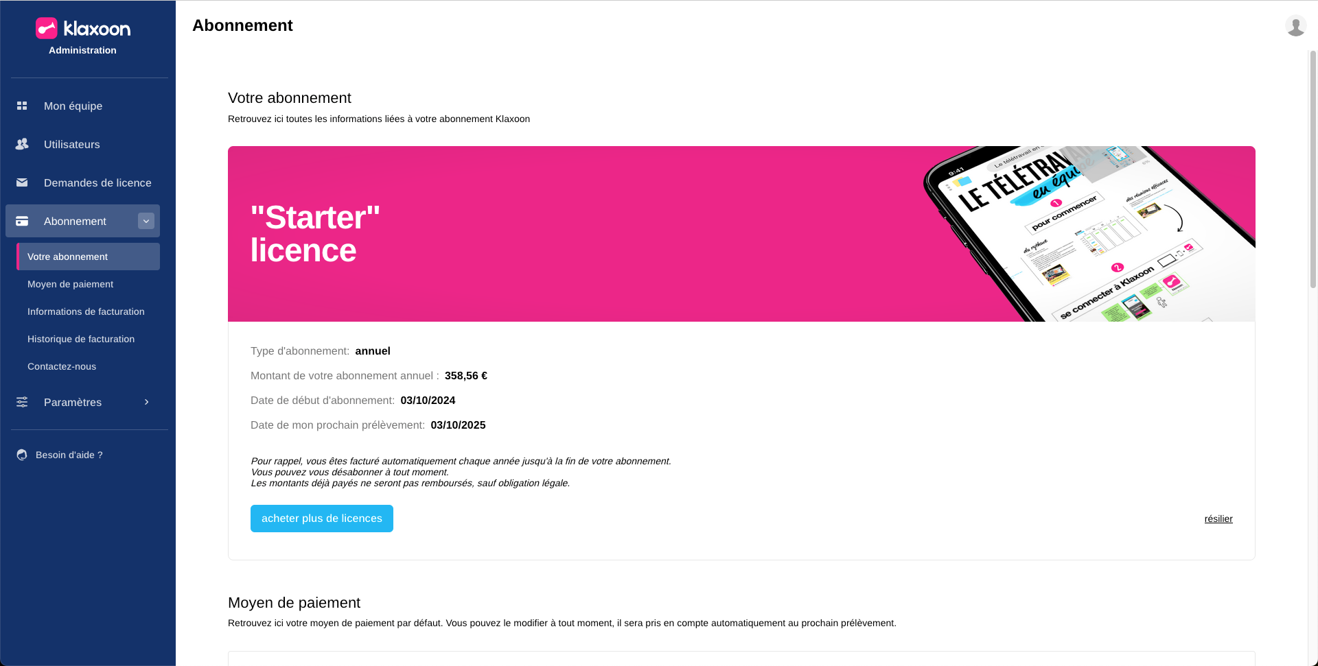 En tant qu'administrateur d'un compte Starter (souscription eShop), vous avez la possibilité de gérer votre abonnement (souscription) à partir de la page Administration et de la page Mon abonnement.
