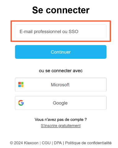 La connexion SSO publique via des plateformes telles que Google ou Microsoft permet aux utilisateurs de se connecter à Klaxoon en utilisant les mêmes identifiants de connexion qu’ils utilisent pour leur compte sur ces plateformes.