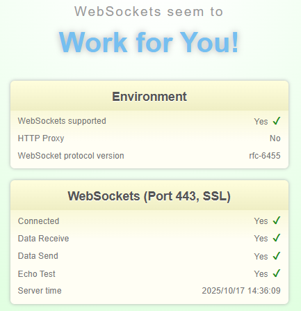 Voici un lien pour tester votre connexion (site en anglais) : WebSocket Test