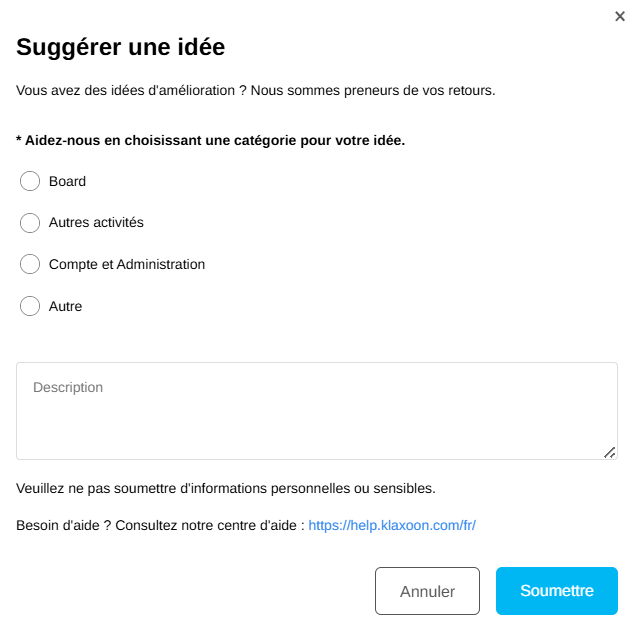 Puis sélectionnez "Aidez-nous à améliorer Klaxoon"