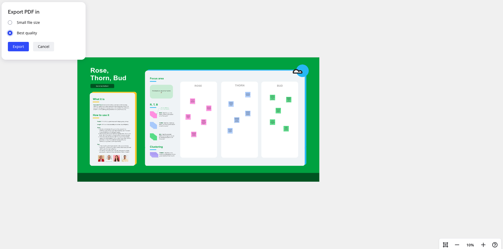 Sélectionnez une zone du Board (frame, éléments, etc.). Le PDF d'une page conserve une qualité vectorielle, permettant un zoom sans perte.