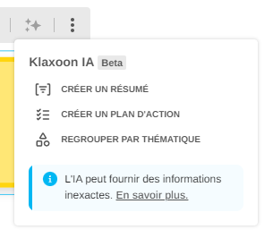 Vous devez accepter nos conditions pour utiliser les fonctionnalités d'IA. Prenez également connaissance de notre Politique de confidentialité que nous avons mise à jour pour décrire la manière dont Klaxoon traite les données personnelles.