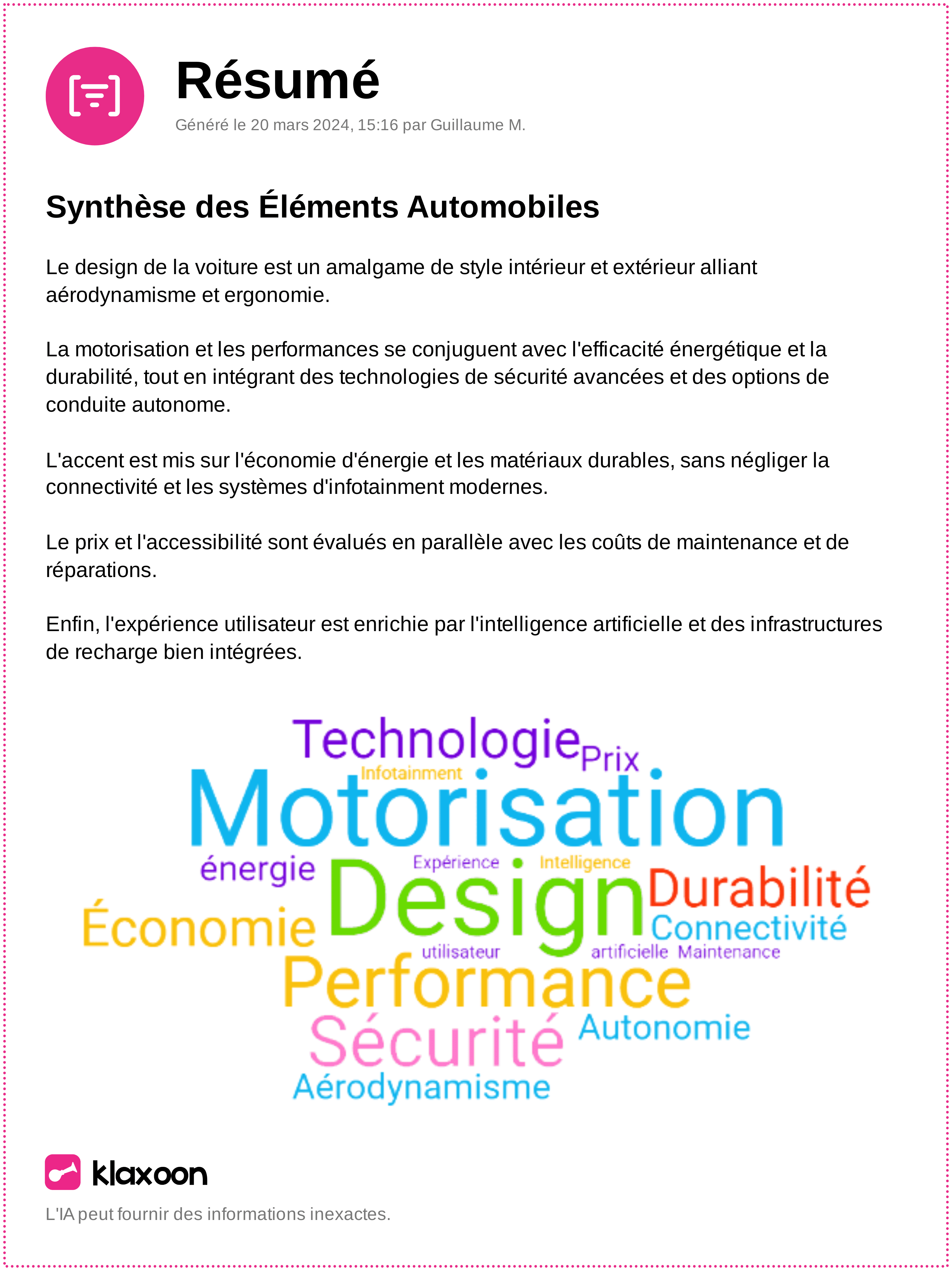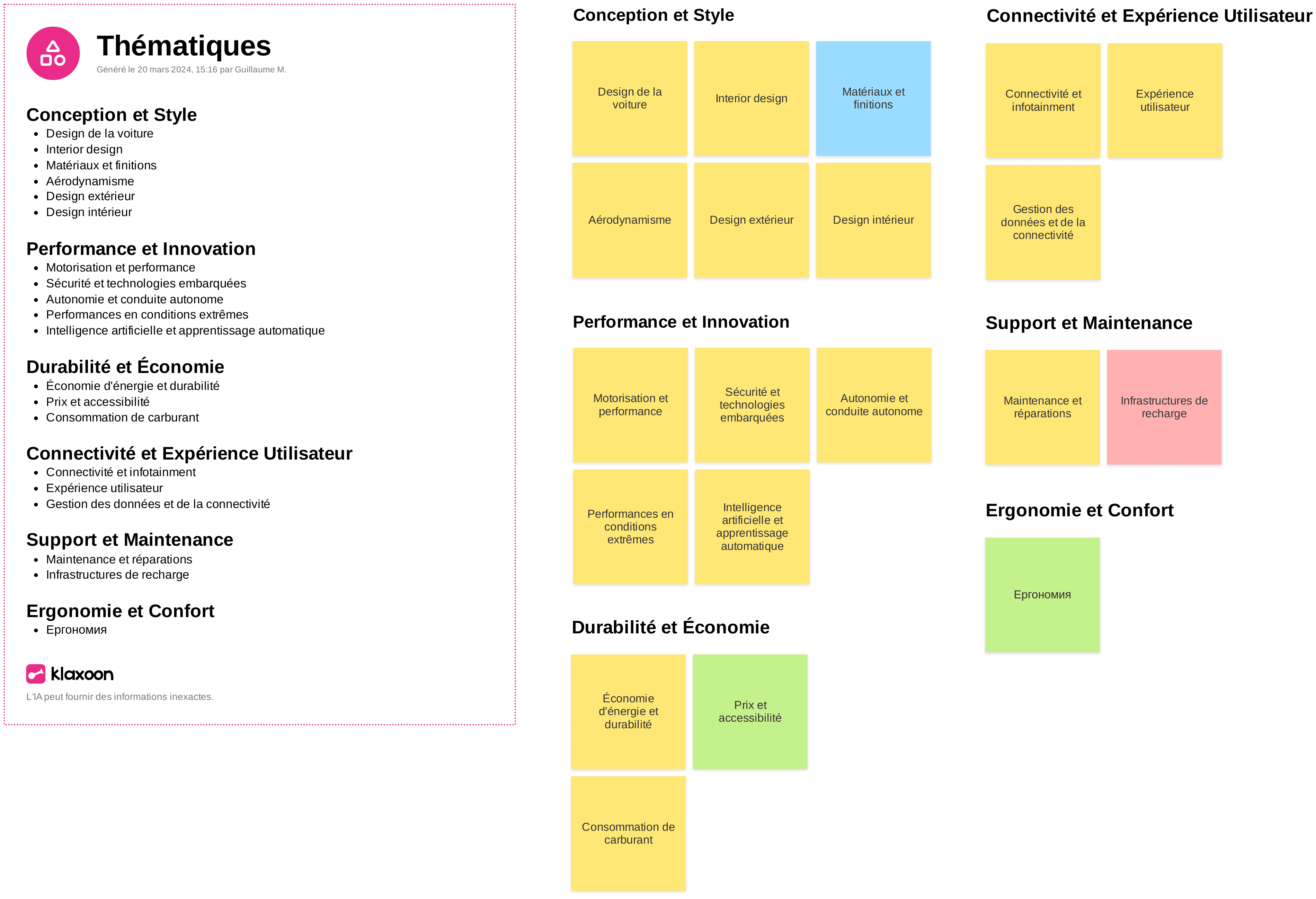 L'objet final généré par l'IA est un format "fiche" reprenant dans un objet texte le contenu des idées regroupé par thématique, ainsi que ce même regroupement des idées Board cibles pour pouvoir rapidement les exploiter dans Board.