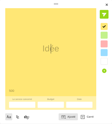 Les dimensions sont utilisées pour mieux qualifier les idées. Les dimensions prennent la forme de champs libres au bas de chaque idée. Les participants sont libres de saisir des détails supplémentaires (par exemple, prénom, date, mot-clé). Le modérateur peut ensuite utiliser ces critères pour affiner le tri des idées.