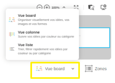 Si vous souhaitez aller plus loin dans l'organisation de vos idées, en tant que présentateur, vous pouvez créer des zones pour vous aider à organiser vos idées, ainsi que pour faciliter la navigation dans Board d'un simple clic. Voir cet article : Comment ajouter des zones ?