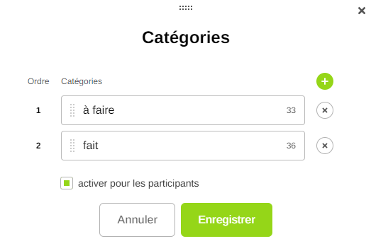 Les catégories facilitent l'organisation des idées. Le facilitateur peut créer et nommer jusqu'à 50 catégories. Cela permet aux participants d'attribuer des catégories à leurs idées. L'animateur peut ensuite utiliser les catégories pour trier les idées et les regrouper au tableau.
