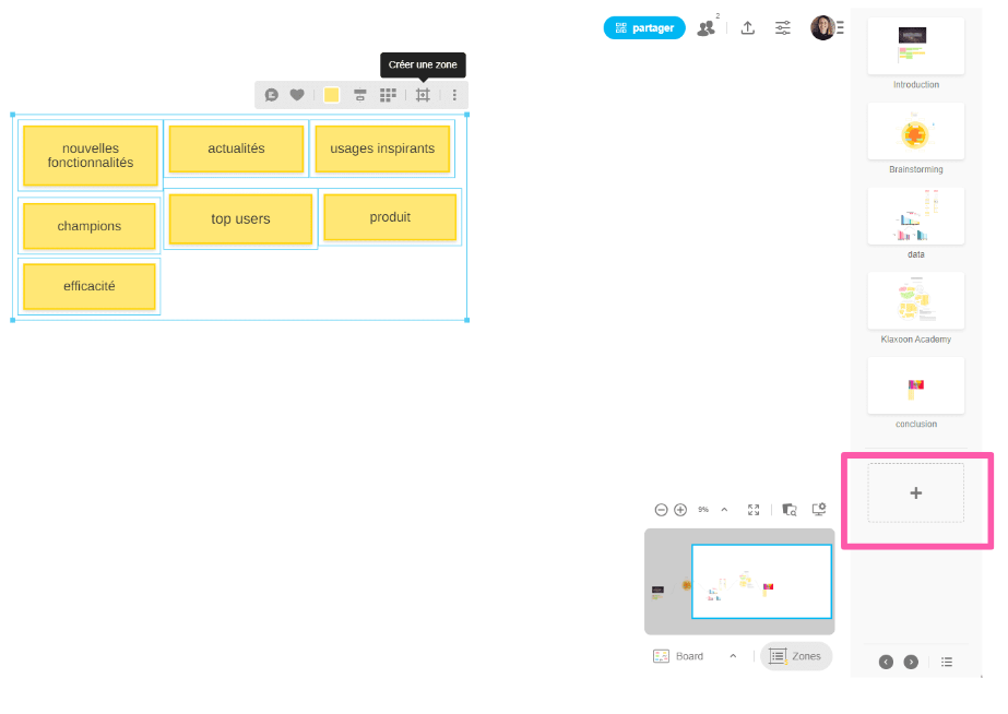 Les Zones sont vos meilleures amies pour créer des sections claires sur votre Board. Elles vous permettent de regrouper visuellement des idées qui sont liées.