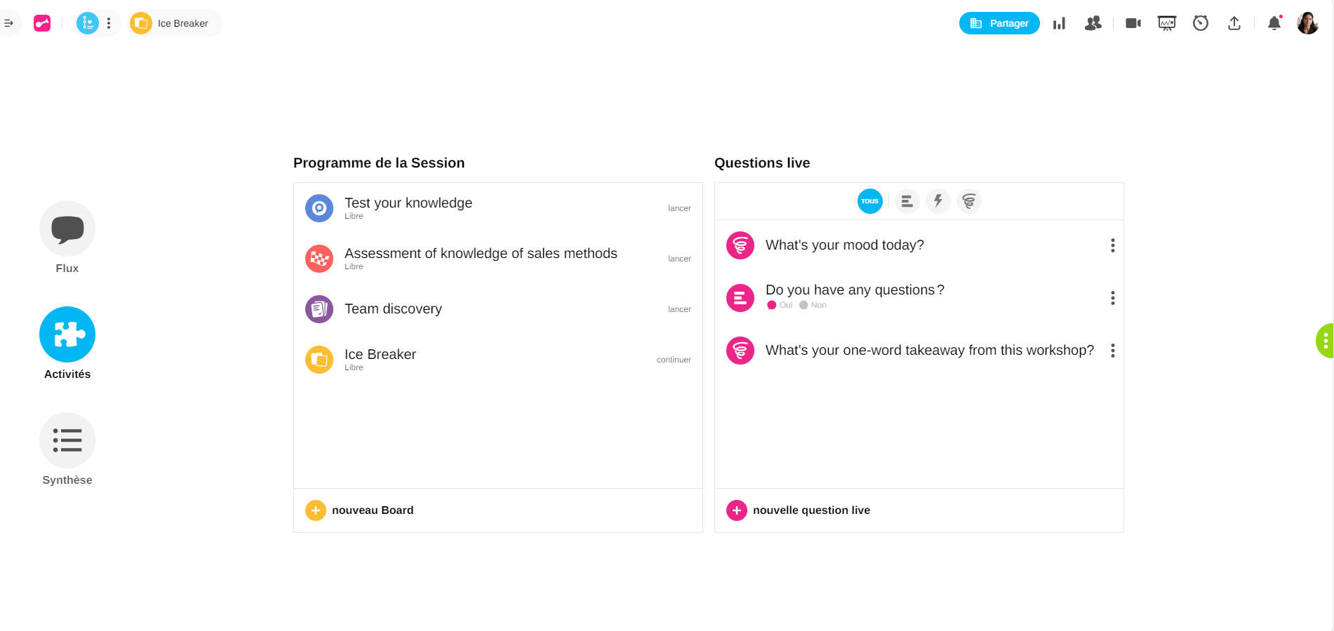 Vous préparez ou animez une Session et souhaitez ajouter un Board, cliquez sur "Activités" situé sur le volet de gauche.