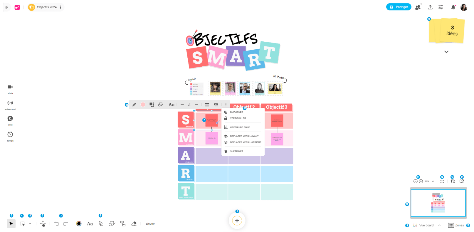 Glissez-déposez une idée pour la déplacer, et jouez avec sa taille ; double-cliquez sur une idée pour la modifier.